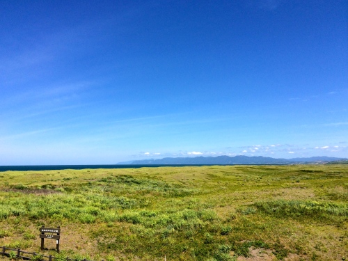 ハマナスの丘公園。石狩灯台。水平線に僅かに見えるのは日本海。映画『喜びも悲しみも行く歳月』の舞台。撮影用に赤と白に塗り替えた。
