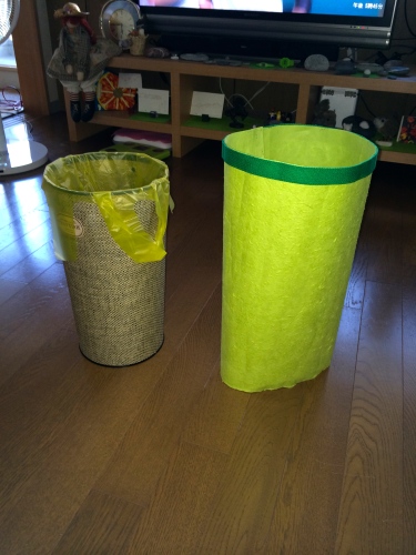 写真上:左は今迄のダストBOX。右はカバーを製作。写真下:カバーを被せた。材料は100均で購入。和紙:高さ80cm長さ1m20cm 。生地帯:高さ25mm長さ1m。何れも100円。200円で好みに変身(笑)。