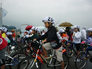 記念すべき 第1回目の 小学1・2年生の部に子供が挑戦しました。勉強はまったくダメ・・・と気が付いた最近、これなら・・と思い参加しました。開催前に2回ほど現地へパパと走りに行きました。行ってみてびっくり、小学生でも ちゃんと競技用の自転車にウェアを着ています。お遊びで参加するので 普段の子供の自転車に 服装は普段着。練習にきている車も 関西から東海地方のナンバーがいろいろ・・・帰ってきた夫は 「自転車用のウェアだけでも 買ったら?」「これで参加するのは 恥ずかしいよ・・・」色々言われて心配。実行委員会のほうに、電話して 「普通に乗っている自転車でもいいんですよね・・・?? ヘルメットがあれば 参加できるんですよね・・??」などど、聞いてしまいました。小学2年生なんだし、挑戦することでいい思い出ができる、と思い、普段乗っている 20インチの自転車をかごやライト、スタンドとかを取り払い、普段着にヘルメットで参加したのであります。開催前日に前夜祭も企画され ビンゴゲームや アニマル浜口もゲストです。ビュッフェもあり、なかなか楽しませていただきました。そして 競技当日は小雨。続きは あとで・・・。