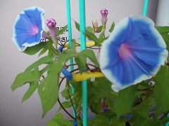 おはようございます。朝なのにちっとも爽やかじゃなくて、暑いですね。そう、私、夏が嫌いです・・・。寒いのもだけど・・・。暑いので子供に「エアコンつけるね~」と言ったら、「寒くなるからいい」なんですとー?!まだ6時だというのに汗ばむくらいの気温よ?あなた暑くないの?うそーん?!うぅ・・・仕方ありません。家中の窓全開にして、朝の準備をしました。暑い・・・家族が出掛けてから、即エアコン稼動!あー涼しい。エアコンさいこー!まったくエコじゃない話でした。学校からお知らせがきました。『育てている朝顔の鉢を取りに来てください』えー・・・親が取りに行くの?暑くて外に出るのが嫌で、取りに行かなければならない最終日にやっと行きました。あれ?軽いじゃん?持ち手もあるし、子供でも持てる重さでした。なんだよー・・・とか思いながら自転車に積んで帰って来ましたが、小柄なお子さんだと、やっぱり持って帰るのは無理かも。モッサモサに茂ってたりしたら、前が見えないだろうし。朝顔なので、朝に花が咲きました。青い花ですね。子供は紫の花が希望だったらしいですが、キレイですね。こっそり仕込んだ栄養剤が効いたのでしょうか。水草育成のために購入したのが、こんなところで役立ちました。(使用は自己責任でお願いします)鉢にペットボトルがセット出来るようになっていて、水やりは簡単に出来るようです。へ~今のって便利なのね。おーペットボトルのキャップがこんななのね。さすが文明の利器!水は徐々に出るのね。(←ここが間違い)などと思いながら、子供とセットしたら・・・ジャージャー流れ出しましたよ!鉢からあふれるかと思うくらいの勢いで。・・・・・・なんだコレ。上は良かったのですが、下から物凄い勢いで流れ出してきました。そこらじゅう水びたし。もちろんベランダに出してあるのですが、植木鉢自体の構造と大きさのせいで合うものがなく、受け皿をしてなかったので、土の流出が心配です。支柱の形状が違うけど、こんな感じ全然文明の利器じゃないじゃんね。もうちょっとどうにかしようよ。っていうか、ふつーに水あげればいいじゃん。と、勝手な思い込みにツッコミまくりで朝からダルくなりました。ところで、毎日2回お水をあげるらしいんですが、帰省中はどうするんでしょ?車に積んで持って行くのかしら?玄関の外に出しておいて、お隣さんに頼んだほうがいいのかしら。情操教育の一環で、生き物のお世話を体験するのは良い事です。わかってはいるんです。だけど・・・・私は土物が嫌いなんですよ。花は好きだけど、切花で。鉢植えを家の中に置くなんて言語道断。観葉植物も人生で一度も買った事がありません。コンクリートジャングル育ちの弊害でしょうか。(違います)【期間限定】【数量限定】あさがお栽培セット【アサガオ】【朝顔】【送料無料】【smtb-KD】【激安】 ハイポネックス 液肥180ml