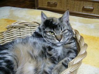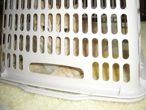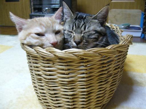 ポン太 『ねぇ、モモ姉ちゃん、もうちょっとそっちへ行けない?』モモ 『無理!』ミーコ 『一歩外に出れば、ゆったり寝られるのに・・・』