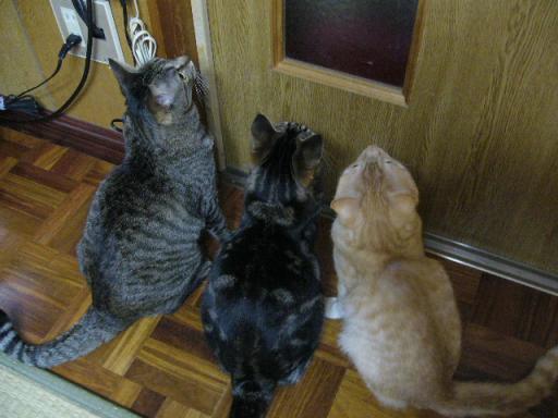 『腹が減ってはイクサはできぬ!』そう言わんばっかりの、3ニャンズが整列した後姿ですにゃん~♪このように、ご飯の準備をするママさんを待つ姿は、たまらないぜ! ミニバラがみごとに満開ですョ~