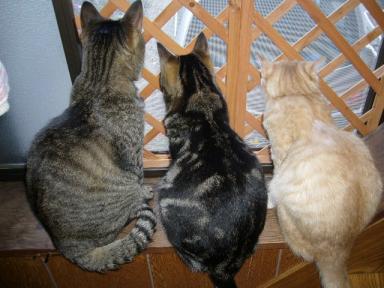 今日も3匹、窓から外の景色を仲良く楽しんでいます~♪モモちゃん、少~しミーコ姉の邪魔してるよ~!で、外の景色、まずまずのロケーションなんですよ・・・ただし、お隣さんの車が入ってなければの話しでした。。。