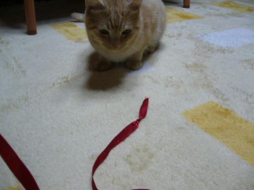紐なんかに遊ばれてたまるか!こんなもの、全然気にならないにゃ~ ったく、ガキじゃあるまいし・・・ し、しまった! ちょっと手が反応しちまったぜ・・・ありゃ、なぜが利き手まで出ちまったぞ・・・もうだめだ、 我慢ならねぇ~! いただきだぃ!!