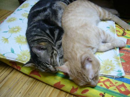 このところ運動をサボっていたので、体がかなり重くなっている。。。 いかん、いかん! このままでは体が鉛と化して、動けなくなるじょ~!! そうだ、また明日からでもランニング&筋力トレーニングを開始しなければ・・・ よっしゃー!! 頑張るぞぃ! (・・・と凄く小さくガッツポーズ) と言うことで~??? 相変わらず仲良しのお二人さんです。。。 【ポン太&モモ】 暑いというのに、 いつも寄り添っていて・・・ とても微笑ましい光景でしたとさ。。。
