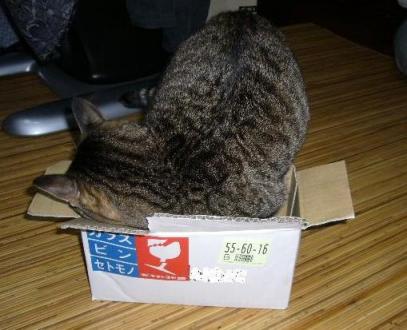 そこに 小さな箱がありました。。。 そこへポン太にゃんがやって来て、 少し、どうしようかと迷っていたようたけど、 やはり・・・ でも、お坊ちゃまぁ~、、、 それはいくらなんでも? 無理があるってもんですョ~!! そっかなぁ? ボク的には、ちょうどいいように見えるけど・・・ いったい、どんな目をしとるんじゃぃ? こんな目じゃ! -- by tomorrow's Joe --