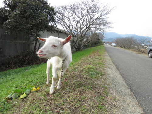 今朝も百合に逢いました。百合は私の履物の匂いを嗅ぐとお約束のように早速フレーメンです。短いけれど顎鬚が垂れ下がり始めました。こちらも道端の除草中です。私が先に丈高く伸び過ぎた草や笹を刈り払うと次に山羊達の出番になります。