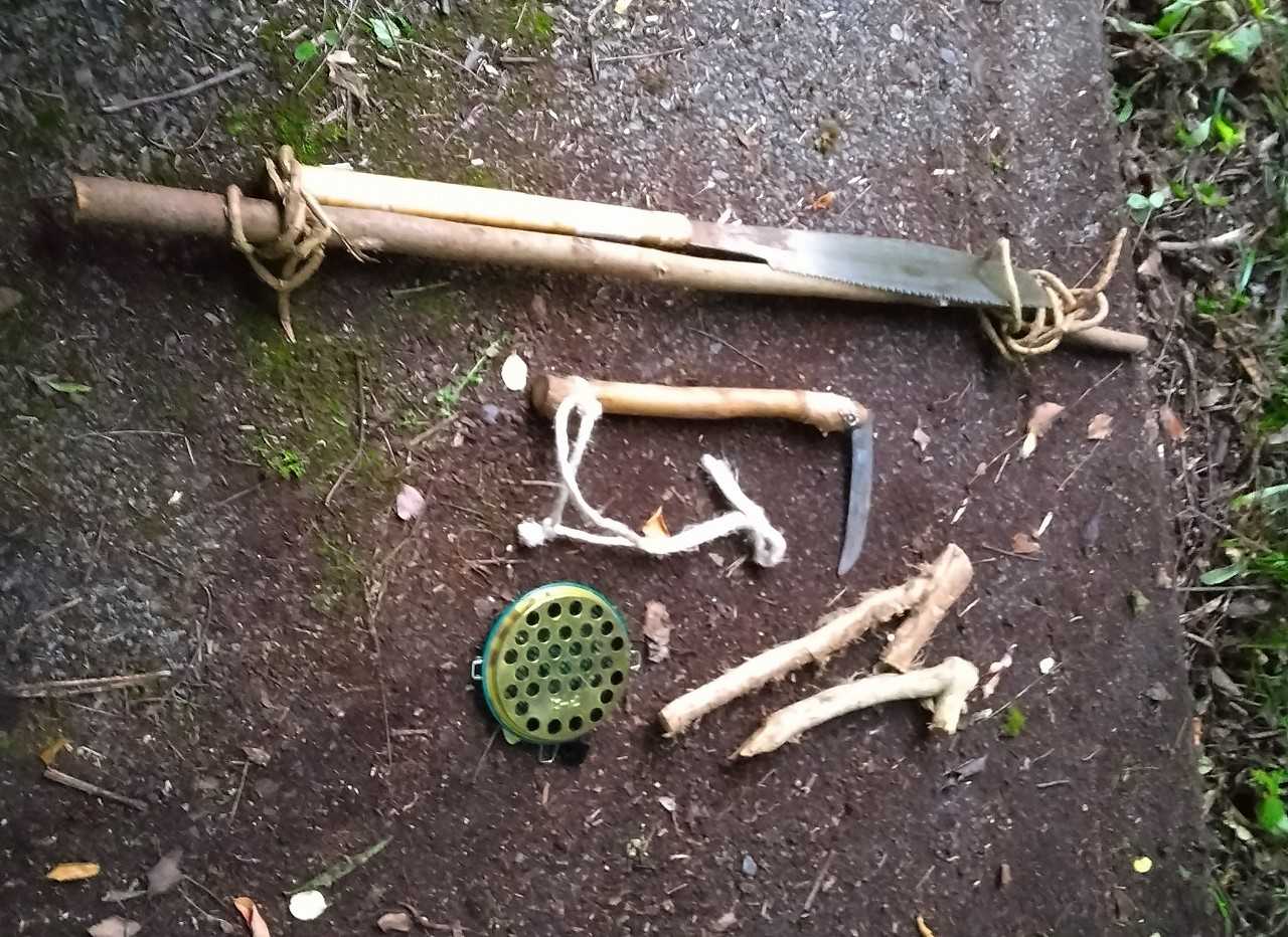 現地調達の杖一本に大鋸と鎌と現地調達のキヅタ製木槌二個をサネカズラでくっ付け左手一本で持ち歩き、腰に蚊取り線香(皿はアー〇中身は金〇)です。そうすれば利き手は空きます。