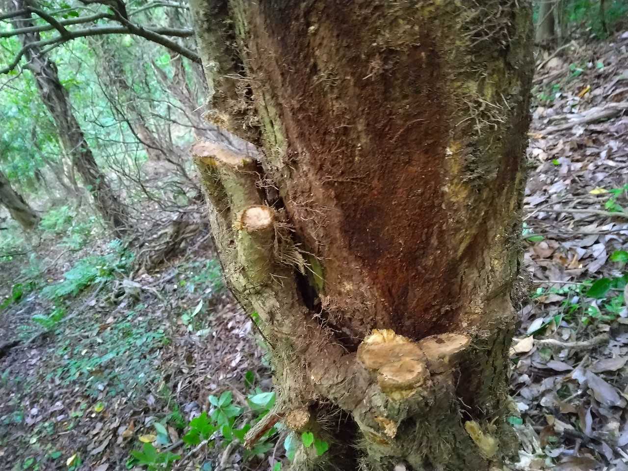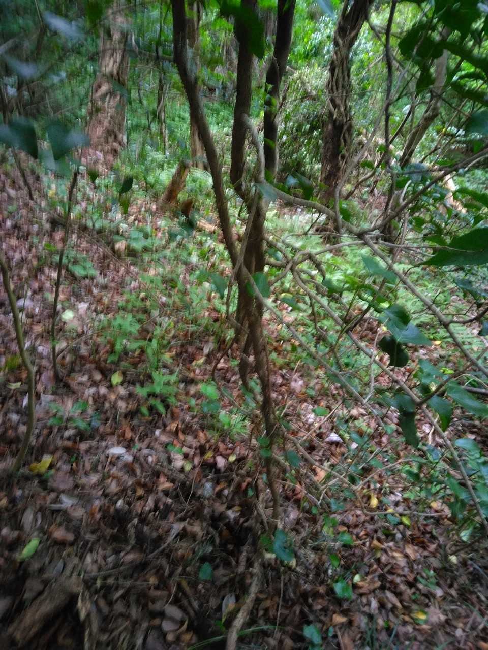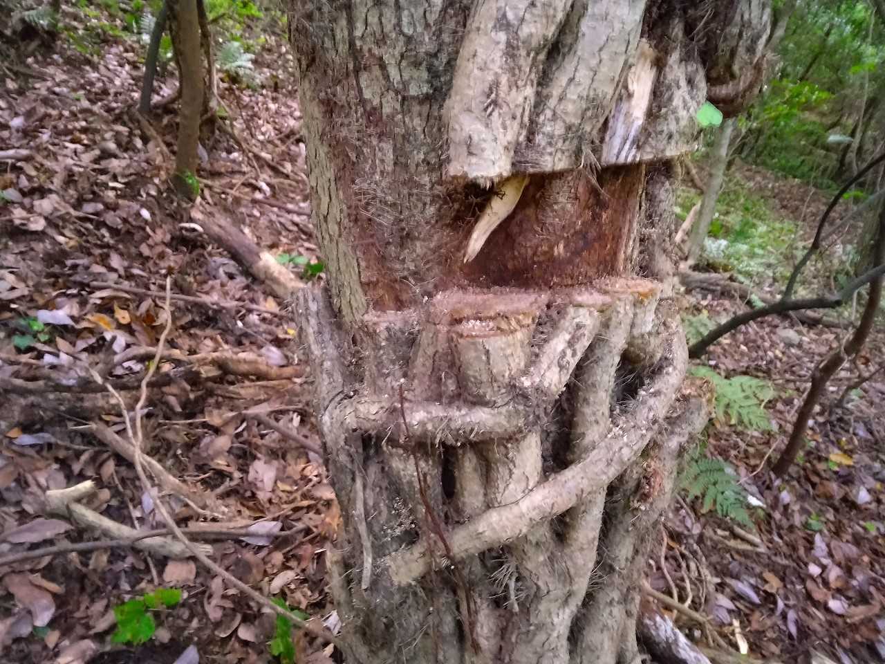 直径が10cm以上の蔓も稀に有りますが、大半は直径5cm前後だけれど、幹回り360度に張り付いて這い上がっているカズラが有るので、救出には手間が掛かります。この写真に写った立木全てに多種多様なカズラが捕り付いています。