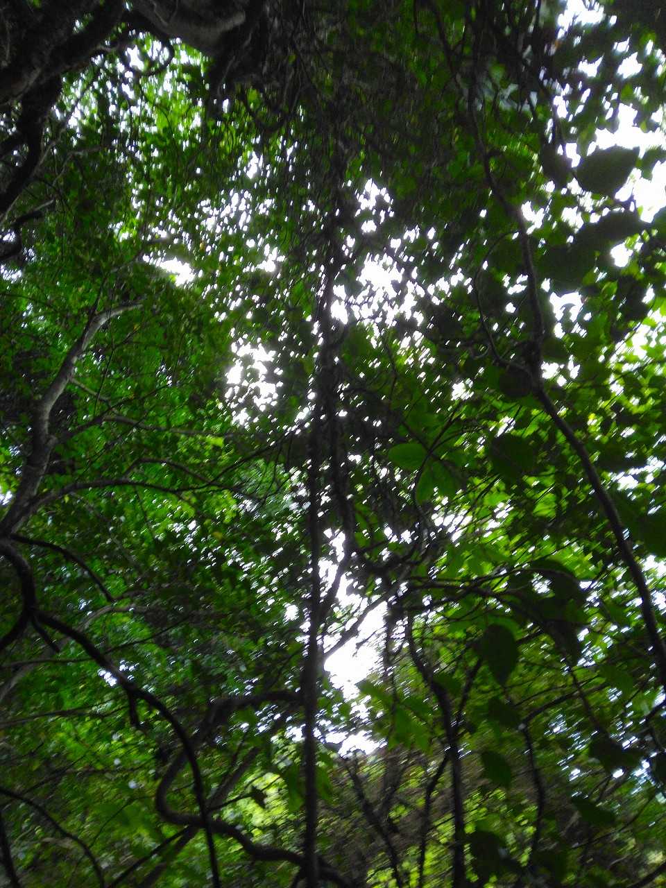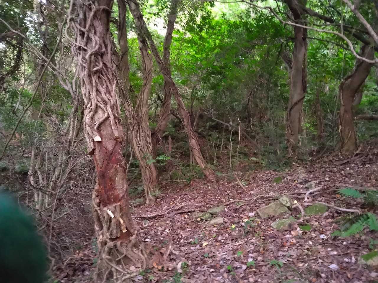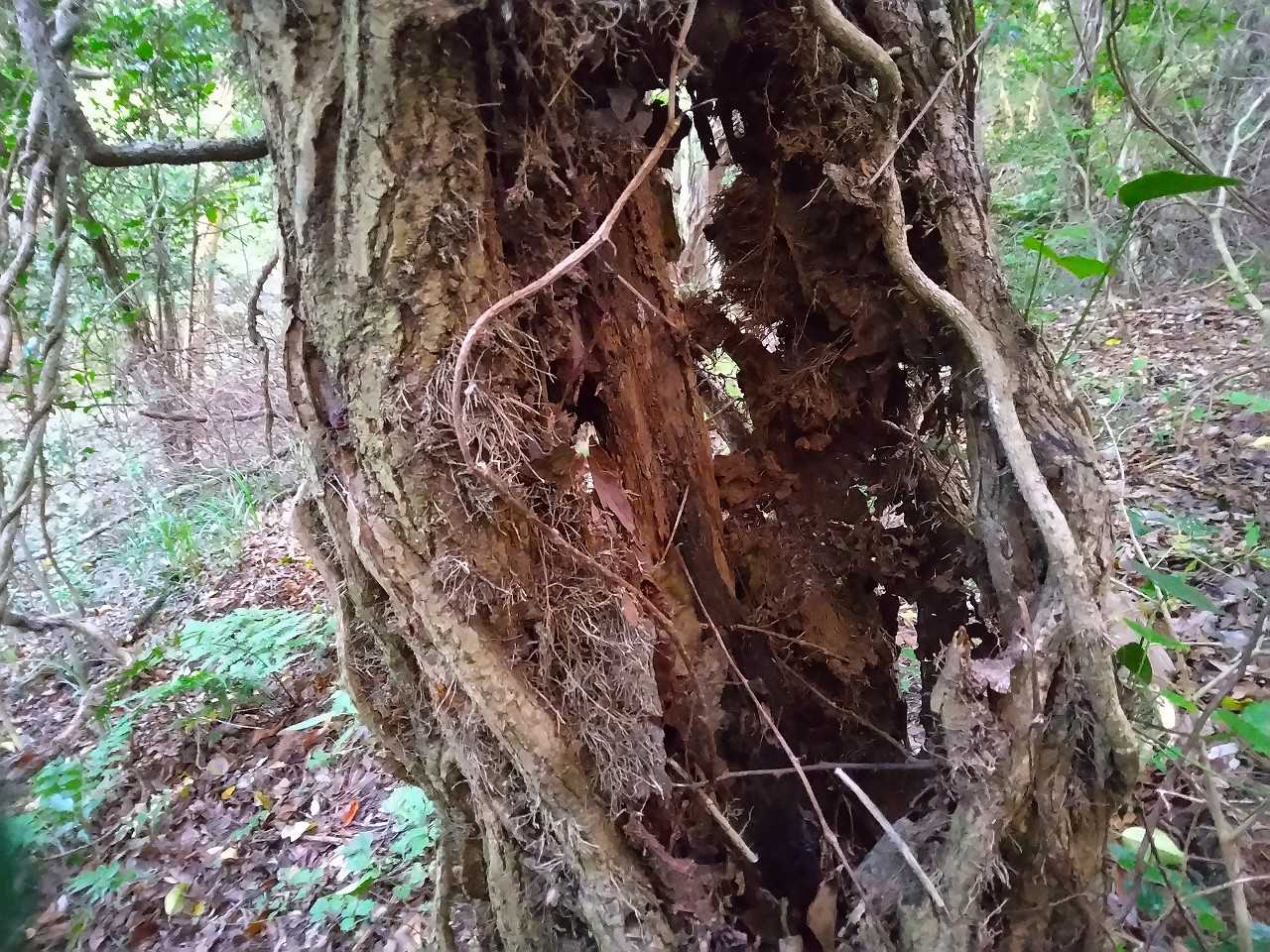 直径が10cm以上の蔓も稀に有りますが、大半は直径5cm前後だけれど、幹回り360度に張り付いて這い上がっているカズラが有るので、救出には手間が掛かります。この写真に写った立木全てに多種多様なカズラが捕り付いています。