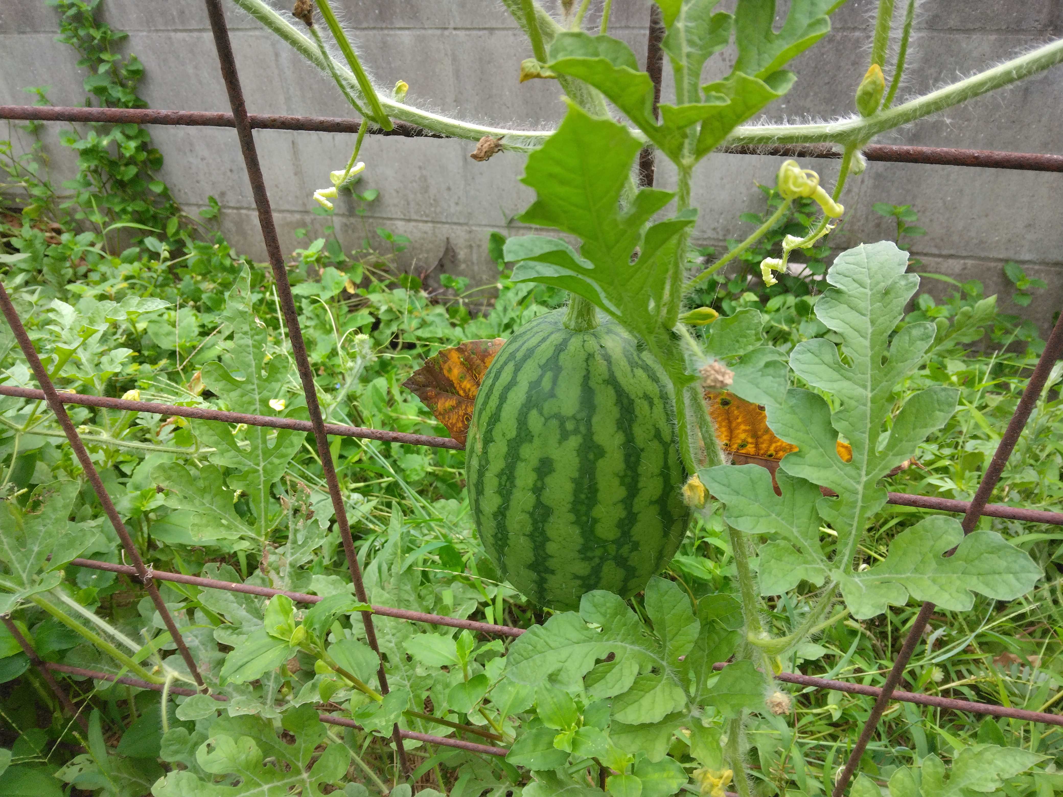 今春裏庭の狭小菜園に植えたスイカ 一番生りの二個の内​瓜楊枝を刺したのは一個だけでしたが、爪楊枝をヘタに刺さなかった方の一個がいつの間にか鉢割れたのに対し、瓜楊枝したスイカは割れなかったので、普及しているとは思えない「先人の知恵瓜楊枝」を二個とも施しました。