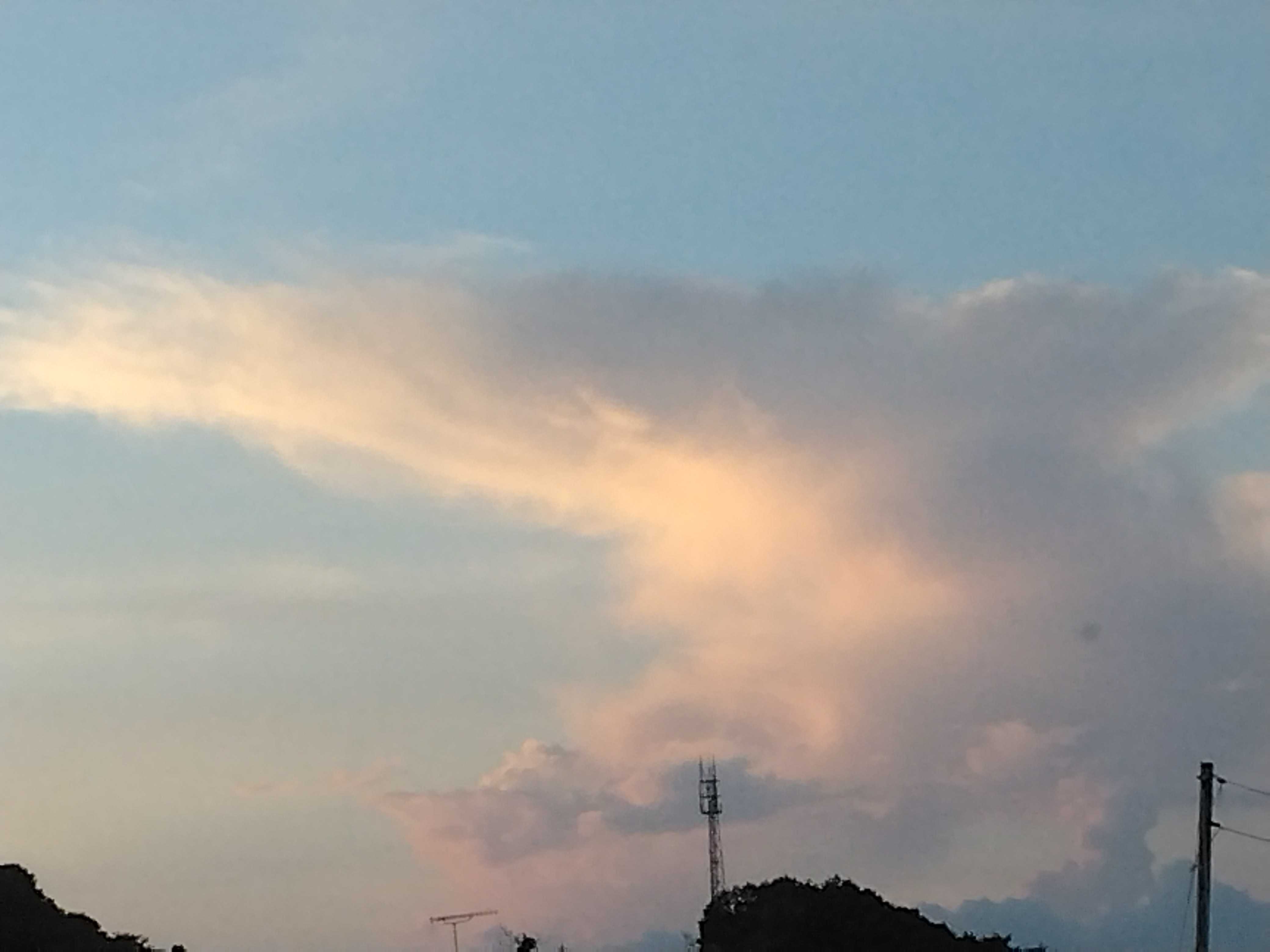 里山整備作業を終え、車に乗り込むと南の四国山地に入道雲が夕日に照らされ綺麗に輝いていました。