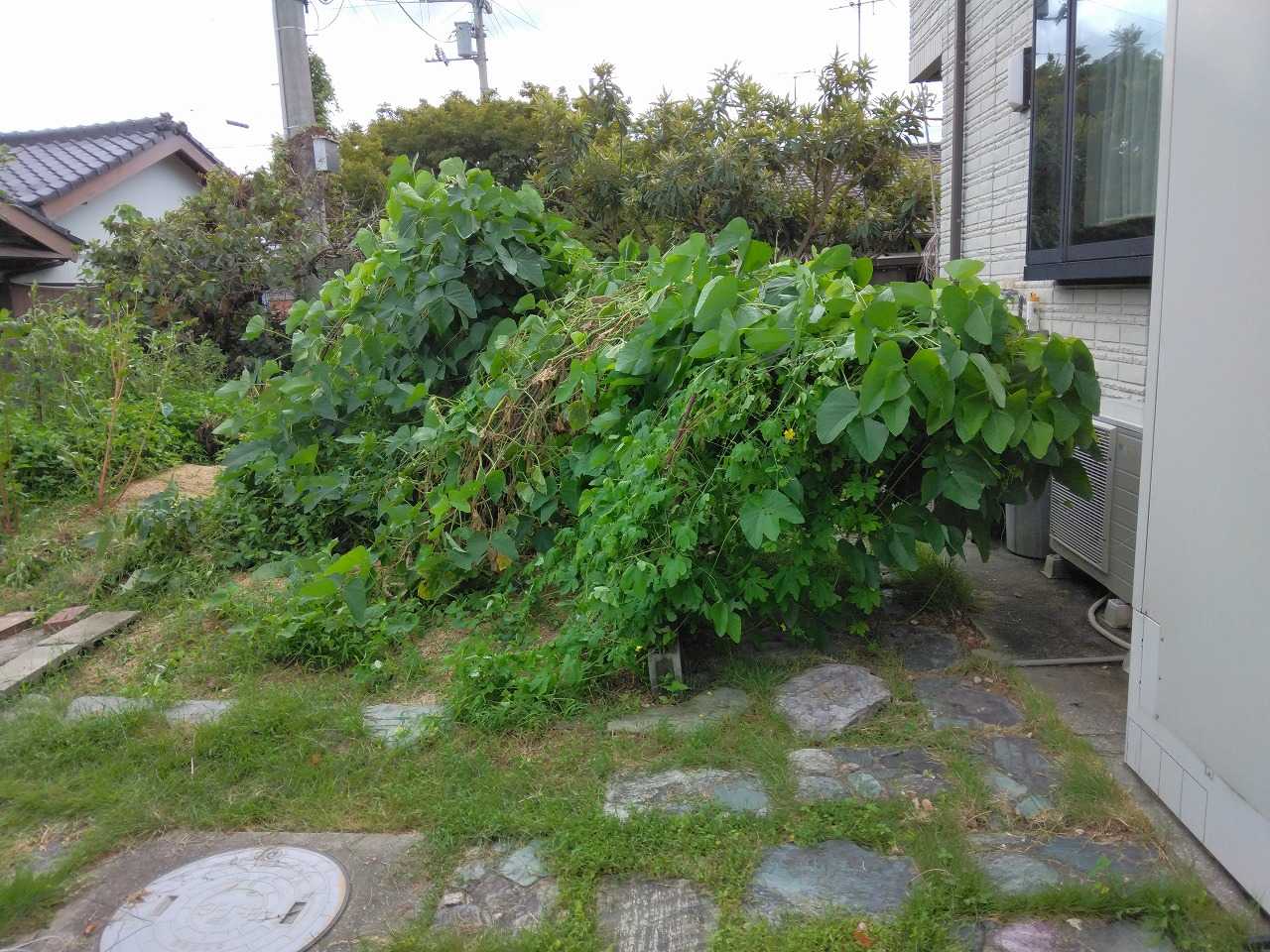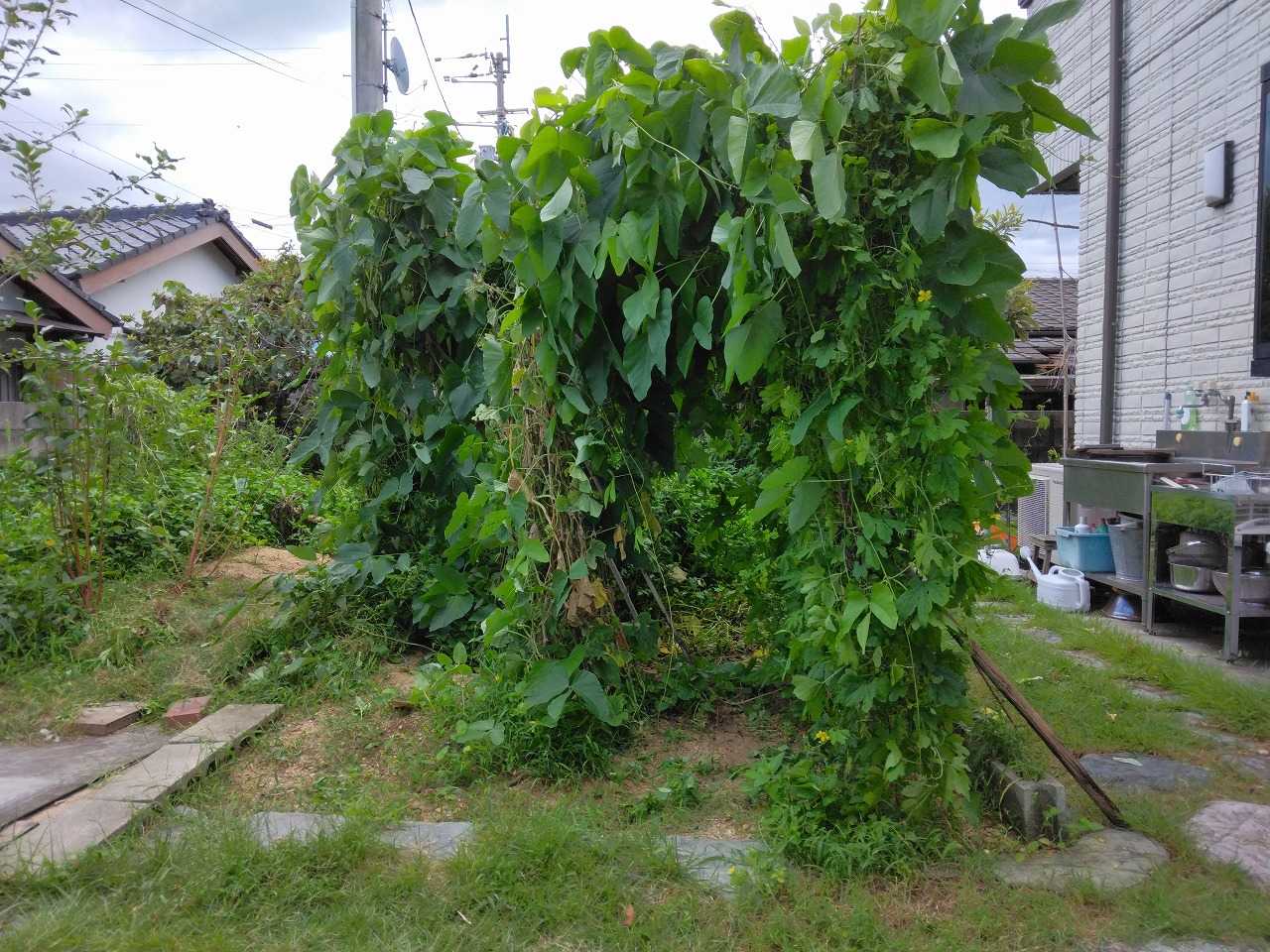 何故なら最後に植えたムクナ豆は畝を越してキュウリに被さり、更に胡瓜の畝も越してゴーヤの支柱まで覆い被さっていたのです。
