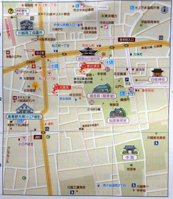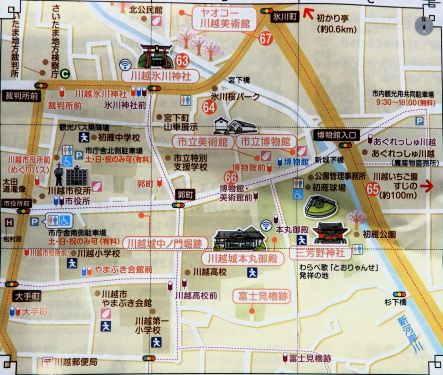 (承前) りそなコエドテラスと道路を挟んで向かいに長喜院という寺があった。(長喜院・山門) 長喜院は曹洞宗の寺院。<参考>新編武蔵風土記稿「冷月山と號す、曹洞宗、喜多町廣済寺の末寺なり、天文・永禄の頃大道寺駿河守が甥、大道寺権内長喜と云もの此地に住せり、後遺跡に當寺を草創す、此人永禄五年十二月十一日没せり、法名を冷月長喜居士と號す、よりて山號寺號とせり、開山大翁文禄元年九月三日寂す」 川越城主の甥の大道寺権内長喜の屋敷が、彼の没後、彼の法名「冷月長喜居士」をとり、冷月山長喜院という寺になったとのこと。(同上・本堂1) 人物が入ってしまったので、彼らが立ち去るのを待って、もう1枚。(同上・本堂2)(同上・苦行の釈迦像) 本堂の左手前にある釈迦像は悟りを開く前の苦行に精進されている姿を表現した珍しい像。ラホール美術館所蔵の原寸大レプリカとのことです。(同上・苦行の釈迦像説明碑)(同上・牡丹の花とミツバチ) 境内の一角に植えられていた牡丹が花を咲かせていて、ミツバチが花粉まみれになって花から花へと飛び交っていました。 長喜院を出て、通りを北へ50mほど行くと右手に「時の鐘」が見えてきました。(時の鐘) 人が多いので路地には入らず、通りを北へ直進です。 この付近では自転車には乗らず、手押しで歩いています。(札の辻)(同上説明碑) 札の辻交差点で右折し、東へ。 ここでようやく蔵造りの町並みが終わり、通行人も減り、自転車に乗って走れる環境になったので、トレンクルに乗り、川越城本丸御殿に向かって走ることとします。(川越城本丸周辺マップ・散策ガイド掲載地図) 市役所前交差点から川越市役所庁舎を左に見て廓町交差点へと走る。 廓町交差点に出る手前100mほどの処に、川越城中ノ門堀跡という標識があったので、立ち寄ってみる。 廓町交差点から北へと延びている道は突き当りが川越氷川神社であるが、氷川神社に向かってゆっくりした下り坂になって居り、南に延びている道もかなり急な下り坂になっているから、この付近一帯は高台になっているのだろう。(川越城中ノ門・堀跡の碑)(同上・堀跡)(同上・説明碑1)(同上・説明碑2) 廓町交差点から200mほど東に進むと、川越城跡本丸エリアへの入口。(川越城跡)<参考>川越城・Wikipedia 自転車の乗り入れは禁止となっているので、トレンクルは手押しにて歩いて行く。 写真の正面奥(南方向)に直進すると東向きに建っている本丸御殿の前に出る。(同上・エリアガイドマップ)(川越城図の碑) はい、本丸御殿です。(同上・本丸御殿1)(同上・本丸御殿2) 校外学習の中学生の一団と遭遇しましたが、御殿の前、東側は広い空間になっている。 初雁武徳殿と刻された石標が建っているが、本丸御殿は昭和初年からの一時期、初雁武徳殿と名を改め、武道館として使われていたようです。(同上・本丸御殿3)(同上・本丸御殿再建の辞 碑) 本丸御殿から300m南に下った地点に富士見櫓跡なるものが地図には載っているが、その辺りまでが本丸ということになるのだろう。 そこが城内一の高所であったようだが、地図を子細には見ていなかったので、気付かずやり過ごしてしまいました。 本丸御殿東側の広場から南東方向を眺めていて目に入ったのが、「とうりゃんせの唄発祥の地・三芳野神社」という看板。(三芳野神社)<参考>三芳野神社・Wikipedia ♪とうりゃんせ、とうりゃんせ、ここは何処の細道じゃ♪ この歌に出て来る「天神様の細道」というのは、この三芳野神社の細道でありましたか。(同上) ということで、ヤカモチは上の写真で言うと、画面左手奥から境内地に入って来たのですが、少しでも「細道」らしき雰囲気を出そうと、石鳥居を潜って参道を少しばかり下った処で、振り返って撮影したという次第。(同上・拝殿)(同上・説明碑)(同上・蛭子社)(同上・大黒社)(同上・わらべ唄発祥の所碑&川越城七不思議碑) 社殿の南西側広場には、わらべ唄発祥の地の碑に並んで川越城七不思議の碑もありました。 川越城七不思議は初耳ですが、興味のある人は下掲写真をクリックしていただき、大きいサイズのフォト蔵写真でお読みください。(同上・川越城七不思議説明碑) 碑の前にベンチがあり、先客が立ち去られたので、それに腰掛けることとする。境内の大楠の写真を撮ったり、加熱式タバコを取り出して一服するなど、休憩をしていたら、小学生の一団が何人かの先生に引率されてドヤドヤとやって来て、整列。腰を下ろして先生からの注意事項の伝達を受けていました。 どうやら、この広場でお弁当タイムとするようで、「先生の目の届く範囲内で各班に分かれて昼食をとるように・・」などのことが聞き取れました。(同上・大楠) はてさて、社殿修復工事に伴い、伐採されることになった大楠とは、この写真のクスノキなんだろうか。(同上・大楠説明碑) ということで、ヤカモチは退散であります。 立ち去ろうとするヤカモチに、男性の先生が「すみませんねえ。」と声を掛けて来られましたが、