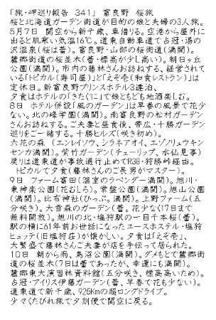 友人・岬麻呂氏から届いた旅便りです。 今回の旅は、「桜と北海道ガーデン街道が目的の、娘と夫婦の3人旅」とのことです。●「旅・岬巡り報告341」富良野 桜旅●同上 添付写真(その1) (その2)(その3) (その4)(その5) (その6) 素晴らしい写真の数々、いい桜旅をされたようで、何よりです。 ではでは、私達もご相伴させていただくことと致しましょう(笑)。5月7日関西空港→新千歳空港・レンタカー→占冠・湯の沢温泉→富良野・山部の桜街道→朝日ヶ丘公園→新富良野プリンスホテル(3連泊) 朝日ヶ丘公園の満開の桜、見事です。(朝日ヶ丘公園)(同上) 振り向けば、遠き雪山、なびく雲。 山裾の高みに、この旅の宿なる新富良野プリンスホテルが見える。(雪山とホテル・朝日ヶ丘公園から撮影) そのホテルの窓から、暮れゆく富良野盆地を眺めつつ・・。(富良野盆地) 森は既に暗く、ニングルテラスに灯がともる。 夕食は、ホテルの「きたぐに」でとられたそうですが、ご同行のお嬢様ともども地酒を楽しまれたとのこと。(ニングルテラス) 静かに夜が更けてゆきます。5月8日風のガーデン→北の峰学園→山部の桜→南富良野・松村ガーデン→帯広・十勝ガーデン→十勝ヒルズ→六花の森→紫竹ガーデン→R38・狩勝峠経由帰還 旅の二日目は、青空の広がる好い天気。(風のガーデン) ホテル併設の「風のガーデン」は「早春の風景で花少ない」とのこと。(北の峰学園) 北の峰学園の桜は満開です。(麓郷展望台) 麓郷展望台からの雄大な眺めです。 この景色からは、大伴家持の「立山の賦」(万葉集巻17-4000)という歌を連想するのであるが、長歌なので、全文引用は面倒、その反歌を引用して置きましょう。立山(たちやま)に 降り置ける雪を 常夏(とこなつ)に 見れども飽かず 神(かむ)からならし (大伴家持 万葉集巻17‐4001)<立山に降り積もった雪は、夏中ずっと見ていても飽きない、その神聖さのゆえであるらしい。> 麓郷展望台に大伴家持がやって来ていたなら、どんな歌を作ったことだろうか(笑)。 大伴池主が「立山の賦」に和した歌というのもあるが、その冒頭の数句「朝日さし そがひに見ゆる 神ながら 御名に帯ばせる 白雲の 千重を押し分け 天そそり 高き立山・・(同巻17-4003)」などは、この眺めに似合いであります。 そして、山部の桜。(山部の桜) 満開、奥の雪山と相俟って、これまた見事な眺めです。(同上) 南富良野の松村ガーデンをご訪問。松村ご夫妻と昼食を共にされ、昼食後は同ご夫妻と十勝ガーデン巡りをご一緒されたそうです。 十勝ヒルズの桜はチラホラ咲き。十勝ヒルズ まだちらほらの 山桜 咲ける丘辺を 富良野のどちと (偐岬麻呂)(十勝ヒルズ) こちらは、中札内村にある六花の森。(六花の森) 六花の森では、エンレイソウ、シラネアオイ、エゾノリュウキンカなどが満開であったとのこと。 ヤカモチは先日、4月28日に川越を銀輪散歩したのであるが、その折に、西武新宿線・本川越駅の駅前広場にて、川越市と中札内村とが姉妹都市提携の関係にあることを示す標識を目にしたのでありました。 川越市出身の画家、相原求一朗の縁で成立した提携らしいが、この「六花の森」を運営している(株)六花亭は「中札内美術村」という施設も経営していて、その美術村内に相原求一朗美術館が開設されているとのこと。 因みに、駅前広場の標識によると、本川越駅前広場と中札内村との間の直線距離は816kmだそうです。<参考>川越銀輪散歩(その4) 2025.5.16. 相原求一朗・Wikipedia(紫竹ガーデン) 紫竹ガーデンでは、可愛いチューリップも。(山部の桜<夕刻>) 暮れかかる頃、山部の桜をまた見つつ、ホテルへと帰ります。 帰ろ、帰ろ、花見て帰ろ 山部の桜 見て帰ろ 帰途は、道東道が事故で通行止め、国道38号、狩勝峠経由のルートとなりました。 夕食は「トピカル」で。 このお店は藤林氏のご長男がマスターをされているらしいですが、上記の松村氏とご同様、藤林氏も亦、度々の北海道旅行を通じてお知り合いとなり、親しくお付き合いされるようになったということであるのでしょう。 このように旅を通じて現地に知人・友人ができてしまうと、もう通りすがりの旅行者という感じではなくなり、その地の見え方、感じ方も、旅の味わい方も、違ったもの、より深いものになるのでしょうね。幾十年 旅行き行きて どちとなり 通り過ぐべき 地にはあらなく (偐岬麻呂)5月9日ファーム富田→旭川・東神楽公園→常盤公園→旭山公園→比布神社→上野ファーム→大雪森のガーデン→塩狩駅・一目千本桜 この日は、先ず富田ファームに立ち寄り・・。(ファーム富田) 温室ですが、ラベンダーの花が咲き群れています。(東神楽公園) 旭川の東神楽公園の桜は、あらかた散ってしまって、花むしろ状態。 常盤公園は満開です。(常盤公園) 旭山公園も満開の桜。(旭山公園) 比布神社も満開。(比布神社) 上野ファームは、チューリップ、スイセンが満開。 桜は五分咲きでした。(上野ファーム)(大雪高原) 大雪高原の桜はまだ蕾。 大雪森のガー