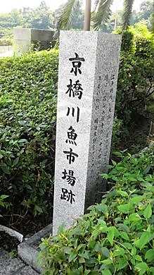 土佐堀通りとの交差点の西角に京橋川魚市場跡の碑が建っている。