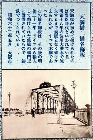 土佐堀通りを西へ谷町筋に出た処で、いつものコースになり、大川(旧淀川)に架かる天満橋を渡る。橋を渡った東側の小さな公園に、天満橋橋銘飾板が展示保存されている。