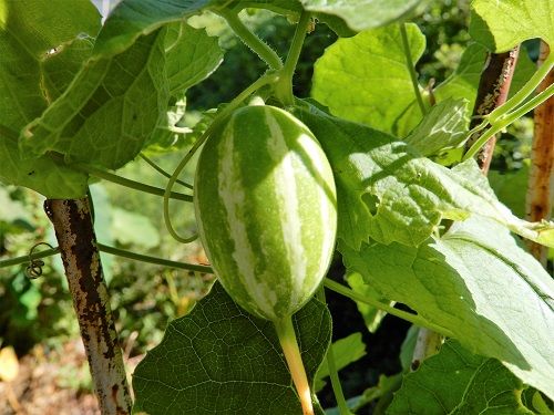 墓参の道でカラスウリの実が早くも生っているのを見ました。