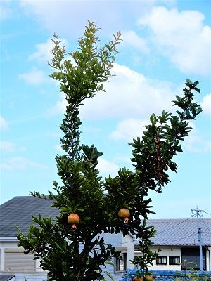 向かいの空き地のザクロの木は色づき始めた実をつけています。