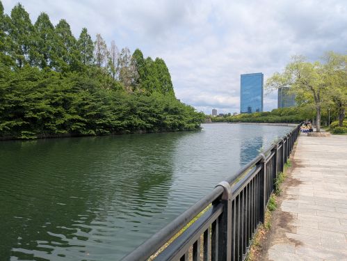 そして、ヤカモチお気に入りのビュースポットを経て、写真正面奥の銀杏並木の道を左へと回り込んで、大阪城公園を通過。