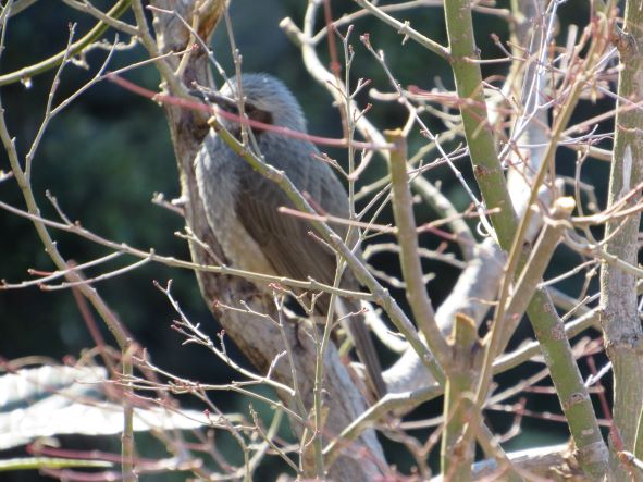 動くらし樹液に聡き春の鳥 庭の楓の木に鳥がやって来るようになりました。 今日はヒヨドリがやってきて、楓の木の真ん中に陣取っていました。 花木・庭木の本には次のように書かれていました。「1月までに剪定を終わらせないと、2月には休眠から覚めて樹液が動き出し、切り口から流れ出て樹勢がそがれます」 ヒヨドリをズームにして撮ると、確かに小さな芽が出ていて、息づいているように感じます。 餌のない季節、貴重なメープルシロップをたくさん吸ってほしいですが、たまには他の小さな鳥にも譲ってほしいものです。