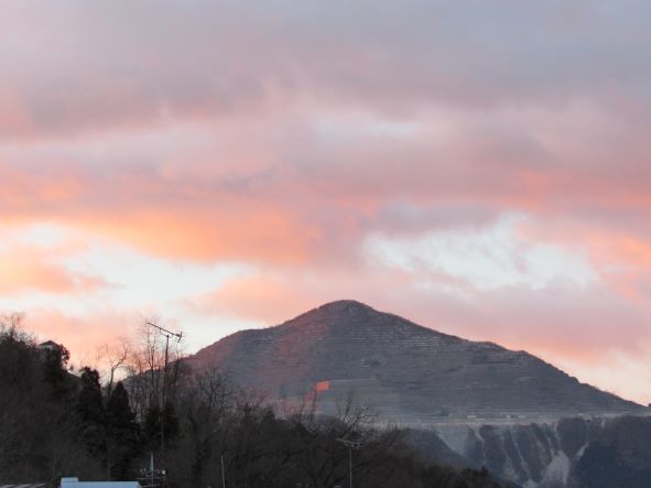武甲山染め山の端に春朝日 朝6時半頃シャッターを開けました。 武甲山が朝日で赤く染まっていました。 ずいぶん明るくなるのが早くなりました。 と思いながら窓を開けたままにしていると、冷たい空気がが容赦なく吹き込んで来ました。 窓を閉めてしばらくすると、山の端から太陽の光が射し込んできました。 はやく暖かい春がやってきてほしいものです。