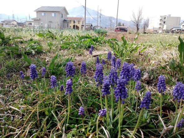 春耕を癒やすムスカリ畑の脇 ほうれん草を収穫し、残渣を取り除き次の野菜を植える準備をしました。 その作業をする畑の脇にムスカリが群生しています。 おとぎの国のとんがり帽子が並んでいるように見えます。 空は青空になったり雲が広がったり不安定な気候ですが、ちょっと心を癒やしてくれました。