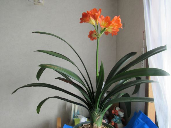 物置の部屋の窓際君子蘭 息子が4月1日に転勤しました。 もっと遠くになると思っていましたが、車で何とか通勤できる所です。 遠くになる時の用意で荷物を小さな部屋にまとめて置きましたが、その必要がなくなり、荷物だけが積んであります。 そんな中で君子蘭が満開になりました。 寒い盆地の冬を窓を通しての少ない日を浴びて何とか乗り越えてくれたようです。 新しい職場でも身体に気をつけて頑張ってほしいと思いながら、君子蘭を見ています。