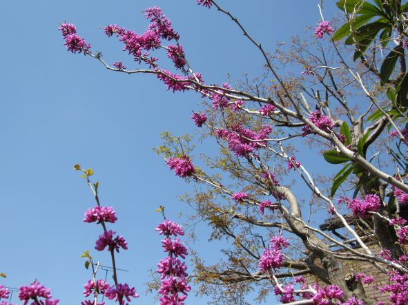 青空に映える紅色花蘇芳 今日は朝から快晴になりました。 庭の花蘇芳が満開になり青空に映えています。 亡き父が植えた花蘇芳ですが、何とか受け継いでいます。 木がだいぶ疲れてきているので、これからも肥料をやったりしながら、なるべく長く花が見られるように手を掛けていこうと思います。