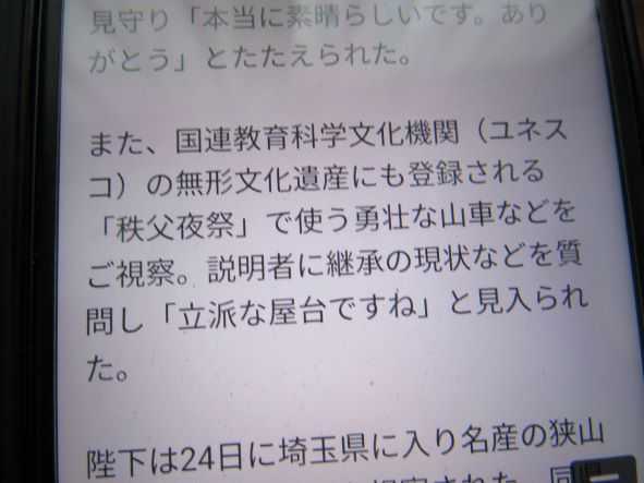 詳しいことは報道されていませんが、ネットでは植樹祭に出席される前に、天皇陛下が秩父神社をご訪問され、神社境内に6基の屋台、傘鉾が飾り置きされているのをご覧になったという記事が載っていました。
