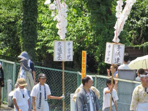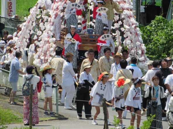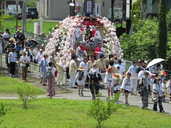 遠くから太鼓の音が聞こえ始め、子供達のワッショイという声が聞こえ、やがて傘鉾が近くの道に姿を現しました。