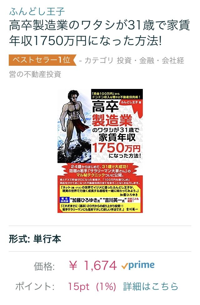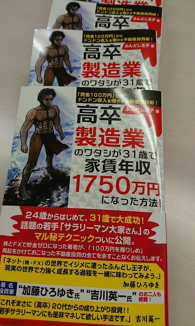 風が取っても強いけど、ブログを更新するよ!こと、大日本☆ふんどし王子です!不動産ランキングまずはランキング順位の確認お願いします♪9位までランクインしましたー!ありがとうございますさて、ライン@でN1さんから嬉しいメッセージが届きました♪昨日、文苑堂でふん様の本、予約してきました〜まだ端末に上がってないって言われたけど予約OKでした人生初の本の予約でした(恥ずかしい)これで本持参で人生初セミナーです(ドキドキ)申込フォーム楽しみに待ってますよろしくお願いします。ありがとうございます!とても嬉しいですねーセミナー参加も宜しくお願いします♪(セミナーで質問しますねw)皆さまもリアル書店で、予約お願いします笑さて、本のはじめにを掲載させていただきます。はじめに 〜高卒製造業でも大家になれる時代〜 はじめまして! “ふんどし王子”と申します!もちろんペンネームですし、イラストのように“ふんどし姿”で生活しているわけでもありません、あくまでもイメージです(笑)。本業が、現役サラリーマンという立場上、おおやけに名前を出すということができないため、このようなペンネームで活動させていただいております。どうぞご容赦ください(汗)。私は富山の田舎に住む、31才のサラリーマンです。最終学歴は地元の工業高校卒業で、仕事は工場勤務。いわゆるブルーカラーと呼ばれる属性の人間です。今日も工場で、3万5000個の小さい部品をチェックしてから、この原稿を書いています。(将来、ロボットに代わられるのは間違いなし!)しかし、私には疲れた勤め人という顔の他に、「不動産投資家」というもう一つの顔があります。不動産投資を始めたのは7年前、24才のとき。現在は、アパート4棟と戸建を4戸所有しており、現在新築を進めている2つの物件を足すと、家賃年収は約1750万円となります。(本業の収入よりずっと多い金額です!)ざっくり説明すると、私はこれまで、以下のような数々の物件を買ってきました。・新築で建てた二世帯住宅・6戸の中古アパート・区分マンション・8戸の中古アパート・65万円のボロ戸建て・200万円のガレージつきボロ戸建て・50万円のボロ戸建て ・新築戸建て・新築アパート・・・。見てのとおり、色々な種類の物件を買いながら、経験値を積み上げてきたのです。 購入、売却をしながら、現在は13の物件を所有しています。(“はじめに”の最後に写真付で全物件の詳細を載せています!)世の中の人の多くは、「不動産投資って、土地を持っているお金持ちがやるものでしょ?」「アパート経営なんて、一流企業に勤める高給取りの人や、お医者さんや弁護士さんなどじゃないと無理なのでは?」という思いこみを持っていると思います。しかし、それは違います。21世紀に入り、日本では田舎の不動産の価格がぐんぐん下がり、また、金融機関も私のような普通のサラリーマンにも不動産投資のためのお金を貸してくれる時代になりました。そんな時代に生まれた私、そして読者の皆さんはラッキーです!あとは、自分が家賃収入を得て豊かになることを決意し、方法を調べて、実行するだけです。 ステキなメンターや仲間たちに出会えたこともあり、私はここまで順調に不動産からの収入を増やすことができました。また富山というのは、全国的に見ても土地の値段に対して、家賃が多く頂ける地域です。土地値が都会の100分の1や、50分の1でも、家賃が100分の1や、50分の1になる訳ではありません。不動産投資をする環境としても恵まれていると思います!学歴もなく、工場に勤めている人でも、幸せになる権利はありますし、その方法はあります。 日本の国力の源は製造業で働く皆さんだと思います。しかし、東芝やシャープ、パナソニックなど、安定していると言われていた大手でもリストラや、ダウンサイジングが行われる時代です。大企業に依存する中小企業であればならなおさらです。真面目に働く方が幸せにならなければ、だれが幸せになるというのでしょうか。属している会社が傾いた時、誰も助けてはくれません!不動産投資の世界は、ある意味、現実社会よりもフラットです。社会人になってからの通信簿は「預金残高」と、「源泉徴収」の金額と、「勤続年数」です。 融資申し込み欄に「学歴」を記入する欄はありません。「東大卒だから1億円貸してあげます」ということにはなりません。日本はモノづくりの国です。日夜生産活動を行っているこの国の原動力の方々が、豊かで幸せにならないなんておかしい・・・。厳しい言い方をすると、我々は「無知」であるがゆえに、自分の「可能性」と、「信用力」に気が付いていないだけかもしれません。私も「しょせん自分なんて・・・」と思う時期が長らくありました。自分を振り返り、低学歴だし、工場勤務だし・・・とネガティブに考えることも可能です。しかし、弱みは強みです! 低学歴→早くに社会に出た実績(勤続年数)。工場勤務→事務職より夜勤や手当で給料が