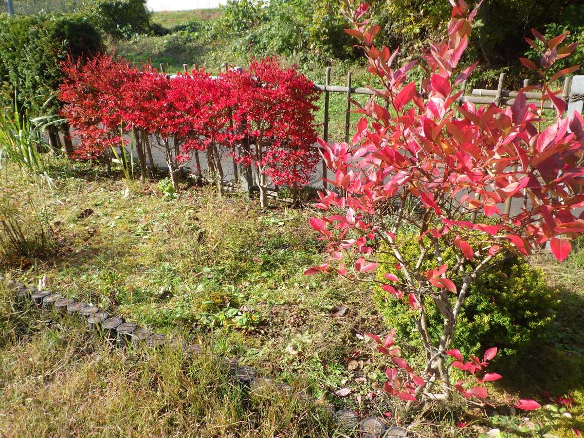 今年はドウダンツツジ(満天星躑躅)が、真っ赤に紅葉しました!手前はブルーベリーの紅葉です。そしてコスモス。ほとんど枯れかけているけど、一輪でも咲いているとうれしいですね。