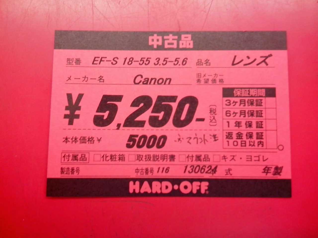 ほとんど意味ないですが、先日買ったレンズの値札小さく「マウント注意」と書かれているのがわかりますかね~?なんか、前にこれを買いに来たお客さんがいて、うまくはまらなかったので、このように追記したということらしいのですが…たしか(記憶が怪しい)デジタル一眼は専用のレンズとフィルム用の両方が刺さるのでマーカーが白と赤の二つあって、こいつは白のマーカーと合わせる…だったはず。実際、お店にあったデジタルのEOS Kissシリーズに問題なくついたので買ってきたわけですが、「教えてくれてありがとうございます」と言うことで本体価格で200円引いてくれました。ハードオフは基本的に付いている値段からの値引はしないことになっているのでちょっと、嬉しかったです。だからって、値引き交渉なんてやらないでくださいね(^^ゞ【送料無料!・代引き手数料無料!】【中古】《良品》Canon EF-S18-55mm F3.5-5.6 IS[ Lens | レンズ ]↑あっ、ソフマップにもまだありますね。
