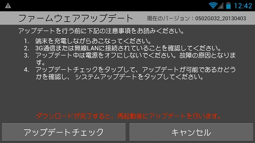 何の気なしにCP-D02で検索を掛けたらCP-D02のファームウェアアップデートのお知らせとお詫びと言うページを見つけた…更新開始日が2013年9月27日だから、始めたばっかりですねお詫びについてはまあ良いとして…「なお、本アップデートにより、Google社が提供するStoreへのアクセスが可能になります。」あらこれはやってみよう…どんな風になるのか…と言うかすでに散々やってアクセスしているんだから、やることもないんですが、ネタということで…※私のCP-D02はアップデートプログラムも含めてひと通り消しちゃっているので、初期状態を作りなおしてからやりました。たぶん、これが最初のアップデートもかけていない初期状態のバージョンだと思いますアップデートチェックをタップすると…ダウンロードが始まって終わるとこの画面…はいをタップすると再起動してリカバリーモードでアップデートが始まります。で、終わって立ち上がってくるといきなり…なんかエラーが出ます(笑)OKをタップすればいいんですけどね(^^ゞで、ドロワーを開いたアプリの中に…プレイストアが…居ません!どこに居るかというと…キャプチャーの通り右上にアイコンだけが鎮座してますココをタップするとちゃんとプレイストアにアクセスできますアップデート後のバージョンはこんな感じしかし、どういう入れ方をしているんでしょうね~素直にGoogleAppsをインストールすればいいのに…なんか問題があるんでしょうね~私は気持ち悪いのでもとに戻しました。CP-D02をフォーマットしてバックアップから書き戻して、なかったコトにしちゃいましたでも、公式でとりあえずプレイストアにアクセス出来る環境を提供するとはちょっと驚きました。内心発売直後のアップデートを提供しておしまいだろうと思っていましたからねそれから、別件でちょっと試してみただけですがIMEIをDocomoのものに書き換えたらSPモードでSPメールも使えました。今ウチのは、Umobile*dのSIMが入っているのでそもそもSPモードを使えないので書き換えはやっていませんけどね。【送料無料】COVIASIMフリースマートフォン「FleaPhone CP-D02」 [CPD02]私自身はおサイフケータイの兼ね合いでT-01Dをメインにしていますが動き自体はCP-D02のほうが良いです…本体メモリーが512というのがネックですかねなんの縛りもなく、FOMAのSIMで通話と通信のおもちゃには良いのでは?…いまさらかな(笑)