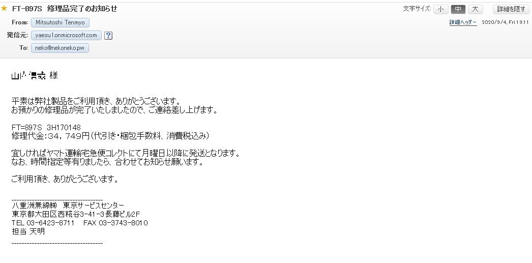 今週は週の真ん中に母の病院に付き添うという用事があったので外見的には1週間のお休みだったのですが、ほとんどゴロゴロしていて交信するネタにことかいていました無線機の修理代金と言う大きい出費の予定があるので、極力散財したくないという訳です。で、8/25に修理見積もりをもらって、修理開始を伝えたFT-897ですが修理作業自体は終わったようですというのも…こんなメールが今日(9/4)の夜7時過ぎに届いたんです発送してから送っても良いような気もするけど、修理金額も含めた金額の代引なので確認しておくと言う感じでしょう見積もりと比べると100円安くなってます…交換予定だった部品が一つ減ったということでしょうか交換しちゃっても良かったんじゃないのそれとも違う理由があったのかな都内からの発送だと思うので、月曜発送で火曜着できるんじゃないでしょうか帰ってきたら、チェックして問題なければチップ張替えをやって完了ですねやっと、電話級のフル出力で運用できます…FT-818NDでも問題ないんだけどね~というわけで、久々の更新がまだ届いていない修理品の状況説明と言う書いていて本人も面白くもないお話でした