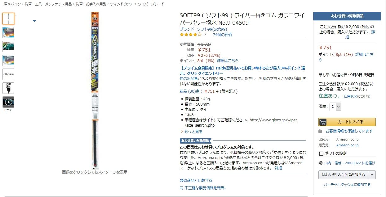 はい 私自身へのサイズの覚書が目的なので面白くもなんとも無いです(^^ゞFitのフロントガラスには雨はじき剤としてフッ素を塗ってありますがそれでもワイパーブレードが傷んできたのであまりきれいになりません…で、近所のホームセンターで買ってきました…運転席用が長さ500mmでガラコの撥水替えゴムだと No.9 助手席が長さ375mmでガラコの撥水替えゴムだと No.4もう少し安い物もありましたが、撥水加工ができるということなのでこちらを買ってきました。取り付けは…お店の駐車場でちゃっちゃと完了~作業の写真なんてありません…というかそんな写真はいらないでしょう~e燃費と言うところに登録していて燃費などのデータを記録しているのですがこのFitのワイパーを交換したのはなんと4年前(* *)1000円ちょっとのゴムでよく持ったな~次はいつ交換するんだろうか…アラートは2年後か20,000kmの早い方にしてあるけど…ということで、台風がやってくるシーズン前にワイパーブレードを交換したよと言うお話でしたしかし九州に台風が向かっていっているようですね…大事にならないよう祈ります