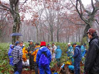 今日は群馬県「緑づくり推進センター」主催の森林ボランティア交流会。我々仲間は4人で出席。今回初めて環境ボランティアに取り組む企業の6団体が出席したので参加者は多い。企業が参加したために、住民活動の代表としてまたもや3年連続で話をすることになってしまった。やむなく活動経過・課題・今後の方向、そして行政への苦言を話す。交流会は雨のために午後の実技が中止になり、13:30分頃終了。いったん家に戻り玉原へ向かう。この冷たい雨の中で仲間たちは作業している。玉原に近づくと霧は濃く気温も下がってくる。ちょっと作業現場まで行っている時間はないので直接宿泊するペンションに向かい16:20分頃到着。もう外は薄暗いが、皆さんが戻ったのは17:00時過ぎで暗くなってしまった。今回の参加者は18名で県内からは2人だけ。遠くから来られる皆さんに頭が下がる。夕食後の楽しい懇談、そして先生からの植林地の植生データ説明、素晴らしい図面になっていた。