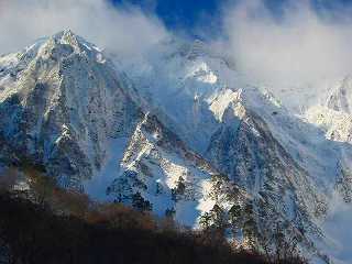 一の倉沢の新道出合いに着いてから沢沿いに旧道出合いへと登り始めると、徐々に稜線の雪雲は後退していった。岩壁に光が刺しこみ輝いてくるといつもの一の倉沢の素晴らしい景色が前方一面に立ちふさがる。