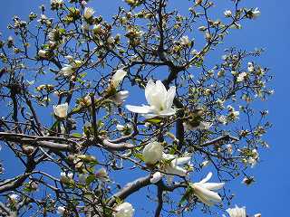 庭の方もコブシが咲き出した。よく見るとヒヨドリに突つかれて花弁の痛んだものが多い。この花は花の先が北を向いて咲くという習性があるけれど何故だろう? 普通の植物は向日性で太陽を向くのだが・・・。
