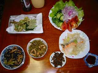 戻ってから晩酌。とにかく最近、野菜と山菜をこれでもか! というくらい食べている。まずは今日も3人分くらいあるだろう。本当に草食動物になってしまった。(写真の他に別皿あり)   ...忘れた! サラダにハム乗せるの!! ...