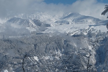 深夜1時まで起きていた新年コンパ。翌朝は7時に起きる。皆はてきぱきと片付けをこなしているのに、やまやろうはもたもたになって道具もぐしゃぐしゃだ。適当にパッキングする。昨日の荒天とは変わり青空も見える。山行中は天気はもちそうだ。ワカン組はDさん、山ちゃん、a木さん、克美さん。スキー組は会長、K尻さん、S田さん、Yたさん、やまやろう。一回券を買って上部リフトまで乗る。ワカン組はリフトに乗れなかったので、ゲレンデ脇をわがやから歩くことになる。9:05 スキー組は先行する。導水管横のスギ林にジグを刻む。新雪たっぷりで難儀するが、先行トレースがある上、Yたさんのロッカーが高速道路を作ってくれる。9:49 貯水池の脇。ここの尾根を登る。やまやろうはジャケットを忘れてきたことに気付く。まあフリースで行きましょう。狭くて急な尾根である。トレースがなかったらとっても辛かったであろう。やまやろうのシールは調子が悪くて、テールが剥がれてきた。ストックに巻きつけていたガムテープで応急処置する。シールの処置や後続のS田さんを待っている間に、ワカン組の姿が下に見えた。意外に早いな。やまやろうは先行メンバーに追いつけるわけもなく、ワカン組に追いつかれることもないから、汗をかかないような適度な速度で歩いていく。立ち止まることが多いのは、額に浮かぶ汗をぬぐう目的もあるが、景色に見とれるせいもある。静まり返った樹氷の中をひとり歩くのは心地よい。日差しが柔らかい影を新雪に落とす。聞こえるのは自分の呼吸音だけ。無心になってG12のシャッターを押しまくる。大辻山だと思う。山々は低い雲に覆われていて、なかなか見えなかったがこの拓けた地点でうまくカメラに収めることができた。大日岳は山頂を雲に隠されているが、純白の大日平が目を惹いた。すぐに雲に消えていき、この一瞬でしか見ることができなかった。貴重だ。あとどのくらい登るのかと思っていたところに、トレースの分岐が出てくる。地形図で確認して右方に進路を取ると、先行していた仲間が車座になって昼食をとっていた。大品山の山頂である。トレースが分岐していたのは、先行単独者が鍬崎山に向かったからである。11:30 登頂である。早かったな。トレースのおかげである。雪化粧したカンバの枝がまぶしい。食事を済ませたら、ワカン組を待たずに下山準備に入る。転んだらフリースは雪だらけになるので、やまやろうは安全第一で滑ることにした。トレース分岐の直下から滑り込むことになるが、ちょうどそこにワカン組が追いついてきた。滑走はやめて全員で記念撮影することにした。登頂できたことに対して、喜寿の克美さんが子供のように喜び、メンバーに感謝の言葉を述べていたのが印象的であった。12:16 さあシュート! パウパウ天国。K尻さんは細板での華麗な滑り。やまやろうはテレマークターンを封印して、斜滑降を多用した。それでも楽しいよ。転ばないのが一番だ。登りのトレースを目印にしてどんどん下る。飛び出した会長はもうどこにいるか分からない。上り返しはうまく避けることができた。12:51 リフト上部ゲレンデに到着。一度も雪まみれになることなく下ってこれた。いやー楽しかった! しかし、ゲレンデで調子こいてずんずん行ったら、眼鏡を飛ばすほどの大転倒。フリース真っ白。おいおい。ワカン組は一時間半ほど下山がずれたか。やまやろうは缶コーヒーを飲んで車の中でうつらうつらして待っていた。全員が無事に下山したら、わがやの前で記念撮影。とても楽しかった二日間であった。