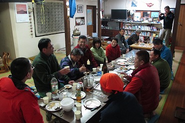 新年会の後、自宅でひとり二次会を楽しんだやまやろうです。飲み過ぎです。今夜はG会の新年コンパである。のんびり構えていたら集合時間を一時間勘違いしていた。慌ててG会館に向かう。原信で買出しして、あわすのスキー場に向かう。上の駐車場に車をとめて、ロッジわがやに荷物を運ぶ。その間に車はみるみる降雪に覆われていく。脱出不能になる車が続出しているので、山男達がスコップ片手に次々と発進させていった。いやー良いことをした後の酒は旨いよ、きっと。開会は18時であるがその前から飲み始めていた。ビールを少し飲んだら日本酒に切り替えた。いきなり本気モードのやまやろう。全部で11名が揃った。トピックスとしては、あわすのとの関係が深い、旧会員のK尻さんが参加されたこと。そして克美さんが参加されたことか。会長の挨拶で、宴会が始まる。何を飲んだかな。蓬莱(S田さん提供)、三笑楽(K尻さん提供)、立山(会館にあった)、銀盤(会館にあった)、紹興酒会稽山(やまやろうの中国土産)、ワイン。旧交を温め、近況を聞き、昔の山行話を披露する。会館を離れてこういうロッジで酒を酌み交わすと、とても新鮮で気分が高揚する(だから杯が進む)。途中でやまやろうのスライドショーが始まる。昨年の祖母谷・西ノ谷の遡行(1、2、3、4、5)と、黄金週間の剱岳北方稜線縦走(1、2、3、4、5)だ。まとめる時間がなかったから、数百枚ある全ての写真を見せた。聞いていようがいまいが関係なしに解説を続けたやまやろう。しゃべると喉が渇くね(だから杯が進む)。飲みまくっとったけど、潰れることはなかった(記憶は薄いが)。例会山行の提案はきちんとメモしておいた。熱燗はほとんど飲まず(銀盤の骨酒くらいか)、常温のコップ酒ばかりだった。日本酒がなくなるまで飲み続け、1時に散会した。いや、よく飲んだ、飲んだ。病的に飲んだ。破壊的に飲んだ。酒に飲まれた?