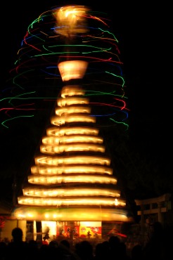 昨夜は3時?に寝たやまやろうです。日中よく仕事していられる。だってーyoutubeは最高のおつまみですよー。音楽も止まらないし、酒も止まらない。今日は午後から大変な、失敗のできない試作が待っていたので、朝から憂鬱であった。どうしようどうしようと思いながら調合してちまちまと準備。いざ流してみたら案外簡単にまともなものができた。2つ目も同様。さほど頭を使わなくても納得のサンプルができた。気を良くしてはいけない。試作の半分が終わったところだ。明日も別の工程が待っている。うまくいったら乾杯だ(何もなくても毎日乾杯だが)。社報が配られた。うほほーおらの撮った写真が表紙に使われている。まあ依頼されたから載るのは当然なのだが。締め切りぎりぎりにあった、たてもん祭りを撮ったものだ。諏訪神社に奉納されるたてもんが、境内で回転しているのを次の条件で撮影した。撮影モード:打ち上げ花火Tv:2秒Av:8.0護岸の高いところがたまたま空いて、そこに三脚を据えた。家族と義両親が一緒にいたのだが、対応を嫁に任せて撮影に集中していた。イメージしていたのはスローシャッターでの光の軌跡。こういうものは初めて撮ったので、いろいろカメラの条件をいじりながらの撮影であった。これは撮影の最後の方。たてもんは回っている時間は意外と短い。だからその時を逃さずシャッターを押さねばならない。新聞などを見ると背景に花火が上がってたてもんが並んでいるという構図が鉄板だ。やってみたいが難しそうだ。