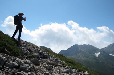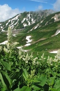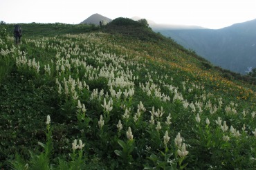 この三日間は、「富山の百山」の取材山行。欅平-祖母谷温泉-不帰岳避難小屋-清水岳-白馬岳-雪倉岳避難小屋-雪倉岳ピストン-蓮華温泉というコースである。テントを持たなくてよかったので、極力軽量化した。水500mlと日本酒二合を入れて、やまやろうの荷物は8kgであった。うーむ共同装備もあるようなないような量だったからな。ここまで軽くできると大変楽である。身の回りはトレラン風。調子の出てきた三日目は、下りや水平道では軽くランニングもできた。この軽さは気持ちのよいもので、これからの日帰り登山は全てトレラン風にしたいほどだ(涼しいし)。写真は670枚撮影した。今回の目的は、清水岳までのコース情報の入手と、清水岳の写真撮影である。山頂付近はそこを目指すまでに撮れるのであるが、山容全体を撮るには少し離れた地点に行かないとならない。そこで目を付けたのが、雪倉岳であった。行程的に朝日の当たる山体が狙える。結果、目論み通りの色調と山容の清水岳を撮ることができた。このために担ぎ上げた三脚が大活躍した。大変満足して山を下りたわけである。沢山ある写真のどれをブログにアップするのかが、今後の悩みである。お楽しみに!清水岳を目指す途中のお花畑。今年はコバイケイソウが当たり年のようで、その群生が見事であった。その奥はニッコウキスゲの群生。他にも数え切れないくらいの種類の花々が咲き乱れていた。これを見るだけでも、清水岳に登る価値があるかもしれない。