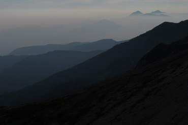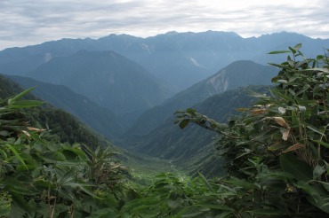 魚津の1時間降水量48.5mmは、観測史上最大だったとのこと。確かに朝の降り方は酷かった。工場建屋の玄関が少し浸水した。土のうを積んだのは初めて見た。こんな天気なものだから、明日の山行は中止となった。残念であるが、仕方がない。空いた時間は、これまで行った山々の記録でもまとめるか。夕方から打ち合わせがあったのだが、現在の課題についてお客さんに説明しに行かないとならない。担当者であるやまやろうに行ってもらわんならん、とは事業部長の弁。え、来週? マジすか。その日滋賀への出張があったが、あっさり他の人に割り振られた。やまやろうの新たな行き先は、アイルランド!それまでに、怒涛のようにデータを集めて報告書を作成しないとならない。やることの多さに現実を直視できず、にへらにへら笑うしかない。まずは、アイルランドのうまいものでも検索するかー。墨絵のような峰々の連なり。かなり露出をマイナスにしないと、この色合いは出ないよ。