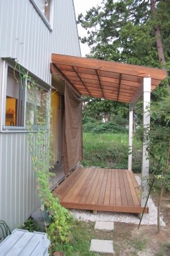 気付いたら布団の脇で寝ていたりするやまやろうです。寝かしつけに失敗か? 記憶があいまいでありんす。毎日暑い。夕飯の酒を励みに仕事を片付ける。今夜はタンポに氷を入れて日本酒(銀盤 蘭 海洋深層水仕込み)を注いでみたが、薄くなってだめだね。日本酒自体を冷蔵庫で冷やすのが早そうだ。二合目からは常温でくいくい。夕方帰宅したら、庭工事が完成していた。こちらは先行して出来上がっていた、ウッドデッキとパーゴラである。日よけも取り付けてみた。ここで何をしようか、これからが楽しみだ。蚊避けはしっかりしないといけない。昨日完成が物置、今日完成が隣地境の塀である。どちらも家の外観に合わせた素材と色である。なかなかじゃない? しかし物置によって、台所からの景色がなくなってしまった。写真のヤマボウシも物置設置に伴い、手前側に移動したのだ。移植に伴い樹形を整えてくれた。これで外収納(と言いながら屋内であるが)の荷物がかなり減るのではないか。畑道具なども屋内に入れていたから、砂が溜まるし置き場所はないしと結構手狭であった。それが物置に移動してくれたら有難い。これで庭で気になっていたところはあらかた片付いたわけで、やまやろうは北庭作りに専念できますわ。今の北庭は、植えたものが伸び放題になっていて、管理されているとは言えない。根付かせることを優先して管理を先送りにしていたのだ。右側については少しは刈ってみたが、いまだスッキリとは言えない。植えたものはしっかり根付いたようだから、全体的に刈り込んですっきりしてみるか。その前に踏み石を揃える必要がある。時間があったら山から取ってくるか。