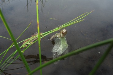 ブナクラ谷の取水口の削られ具合に関して、幾つかコメントをいただいた。やまやろうも情報は得ていたが、まさかここまで激しく、大規模に、これでもかと削っているとは思わなかった。右岸に沿って、赤白の板が斜めになって斜面に刺さっている。この角度で斜面を削るあるいは堰堤を作るという目印であろう。下山時はその踏み跡を利用させてもらったが、結構長いよ。小ブナクラ谷まではあったな。大規模なほど、時間のかかるほど、困難なほど価値のある(おいしい)工事だから頑張ってください。数年もてばいいでしょう。やまやろうの頭の中は、ギネスを飲むこと報告書作成でいっぱいだ。金曜日までに作らねばならないのに、まだデータ取りをしている。終わるのかい。そういった切羽詰まった状況にも関わらず、メンバーが出張に呼び出されたり、半日休暇せねばならないのでにっちもさっちもいかない。何とかしなければならないが、白旗を掲げる用意はできているぞ。先週末の山行計画のように、ぎりぎりまで天候を見極めれば、山行が完遂できたであろうこともある。前日昼に計画中止を決定したのだが、意外と天気がもったので行ったら行ったで取材ができたのだ。この件も、とっとと諦めることなく最後までデータを取ってパソコンをいじってもがいてみれば、何か光明が見えるであろう。諦めたらそこで終わりなのだ。猫又山頂の池塘で羽化したトンボであるが、登った草が倒れて水に浸かってしまったようだ。折角水中から出てきても、こんなどんでん返しがあろうとは。会社生活辛酸なめこでありますが、どこかで花開くこともあろう(と勝手に思っている)。