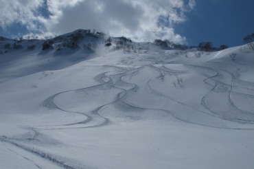 会長経由で50さん一派のスキーツアーのお誘いがあった。栂池バックカントリーであるが、天候が悪ければゲレンデ滑りに移るという、何があってもスキーができる条件なので、参加を表明した。Yたさんも来る予定であったが、当日現れることはなかった(所用により欠席)。待ち合わせ時間は栂池ゴンドラ駅前9時半と余裕があるので、朝日インターから高速に乗って148号線を走った。栂池のゴンドラ前で待つ。てれまくりもあって、人が多い! 駐車代が1000円もかかるが、少し上のどこやらに停めたら無料なのである。駐車場でG会員のH川さんと久々の再会。C320に山道具やスキーが満載されているのがシュールであります。ゲレンデ最上部に行くには、パノラマウェイ乗車券にするのが最適。しかし登山届を提出しないと売ってくれない。備え付けの紙に記入する。なんでかやまやろうがチーフリーダーになってしまった。ゴンドラから見たてれまくり会場である。来たかったなー。盛り上がり方に時代の変化を感じたのはH川さんの参加談から。大人しくなったのね。今回のツアー参加メンバーは7名であります。魚津インター集合組の、50さん、mたさん、Wてさん、新婚T間さん。合流したH川さんに、S竹会長にやまやろう。10:30 栂の森ゲレンデ上部を出発。天気はサイコーです。人も多い。トレースはばんばんに付いていて地形図を見る必要がない。我々は当初天狗原に行くつもりであったが、提案あって黒川沢のロングコースに行くことになった。リフトからはヒヨドリ峰のコルを目指す。樹林の中のトレースを使うので迷うことはない。11:00 コルに着いた。あまり良くない天気予報だと思っていたが、まあ眺望は良い。妙高方面がばっちりだ。これから滑り込む斜面がおいしそうだ。しかしながら左方の斜面にはデブリの発生があり雪崩の危険性もある。最近は律儀にビーコン・ゾンデ・スコップを携帯しているやまやろうである。雪崩ることはないと思いながらも、万が一のことを考えて装備している。そりゃー、粉雪撒き散らしーの写真をいきますぞ。まずはS竹会長から。お次はm田さん。そしてH川さん。50さん。2回滑ってからゆるゆると下り、親沢に出た。これまた素晴らしくだだっ広いゲレンデであります。Wてさん。解放感にあふれる斜面を各人豪快に滑る。たまりません。11:49 トレースや人のいる方に従うと、目印の大岩がある。ここから登り返しになるのだ。ここで昼食とした。めいめい持ち寄った食べ物や飲み物を回す。すいません、やまやろうは軽量化重視で人様に分けるものが何もないがです。うまいもんをもらってばかり。アースカラーのジャケットが多いのは何ででしょう?ヘリスキー客を乗せてひっきりなしに飛んでいるヘリコ。今日は稼ぎ時である。10000円を払うなら、おらだん自分の足で登るちゃ。12:33 再始動。緩い斜面を1598mの若栗の頭目指して登る。日差しは強いが気温が低いので汗だらだらまでには至らず。12:54 稜線に出た。親沢源頭部を回り込むようにして若栗の頭(写真右側のピーク)を目指す。その手前の鞍部付近で、向こう側(黒川沢)に滑り込もうと考えていた。回り込んで稜線です。意外に近い。これは天候が良いからなのだ。前回同じコースを曇天の中たどった50さん達は、時間が長く感じたそうだ。13:19 コル手前でシールを外す。遠くを見ればヒヨドリ峰から滑り込んだ親沢まで見渡せる。よく歩いたものだ。行きますぞー。腐っていない斜面をぞばぞばと滑る。あひーたまらん。日陰はパウダーまで残っている。直下には下りずに右岸斜面をトラバースする感じで標高を下げた。黒川沢本流に出る最後の斜面は良かったねー。奇声をあげながら真っ先に飛び込むやまやろう。写真撮影が目的なのだが、おいしい斜面をいち早く滑りたいという欲も絡んでいる。これは新婚T間さん。急斜面で難易度は高いよ。阿鼻叫喚?雪まみれになる人、気合で滑り込みセーフな人、様々なドラマが生まれる(ホントかいな)。13:43 黒川沢本谷に入った。谷に沿ってゆるゆると下る。谷底を避けるように両岸斜面を切って滑るのは大変なのだ。14:05 ジャングルジム状の堰堤をくぐる。後は林道下りで、はくのりのゲレンデに出るのだ。堰堤手前は大勢のスキーヤーが滑り込んだためにカリッカリに磨き上げられている。おまけに狭い。速度を殺して慎重に下るのは正直楽しい滑りではない。堰堤を出ても同様。林道はかりかりでボーゲンの連続であった。14:16 ゲレンデを右へ右へと移動して道路に着いた。ここからは板を担いで道路脇を歩く。巡回バス乗車は50さんが否定した(厳しー)。カポカポ歩く。14:52 ゴンドラ駅駐車場に到着。サンテインおたりで汗を流して解散。