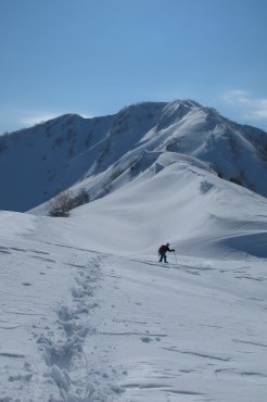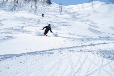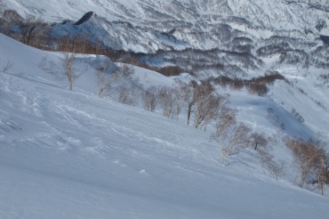 Facebookを投稿できるところにいるのに家にはメールしないのね、と嫁に言われてしまったやまやろうです。だから、嫁からはいいね!を貰えていません。昨日今日でテレマーク三昧! シャルマンから放山に立ち、笹倉温泉へと下るルート。そしてアケビ平から昼闇山に立ち、昼闇谷へとシュート。2日間は天候に恵まれて最高のスキー日和であった。特に昼闇谷へと下るコースは、斜度・広さ・雪質どれも申し分ない内容であった。やまやろうは豪快にテレマークターンを決めつつ、止まれば同行者の滑る写真を撮り続けた。この山域はどこを滑ってもいいね。来年は高松山を目指そうかと、既に計画を立てる始末。それだけ楽しいということ。詳細な記録は、これからアップしていこう。2日間で600枚以上撮影したから、写真は厳選しないとならないな。尾根から昼闇谷へと滑り込むYたさん。この斜面は最高でしたな。スピードを出してノートラック斜面の雪を蹴散らすのが快感だ。